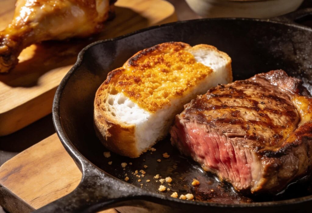 - Insufficient preheating – placing the steak in a lukewarm pan means the initial heat transfer goes to warming the pan, not browning the surface. A properly preheated cast iron skillet should lightly smoke before the protein is laid in.